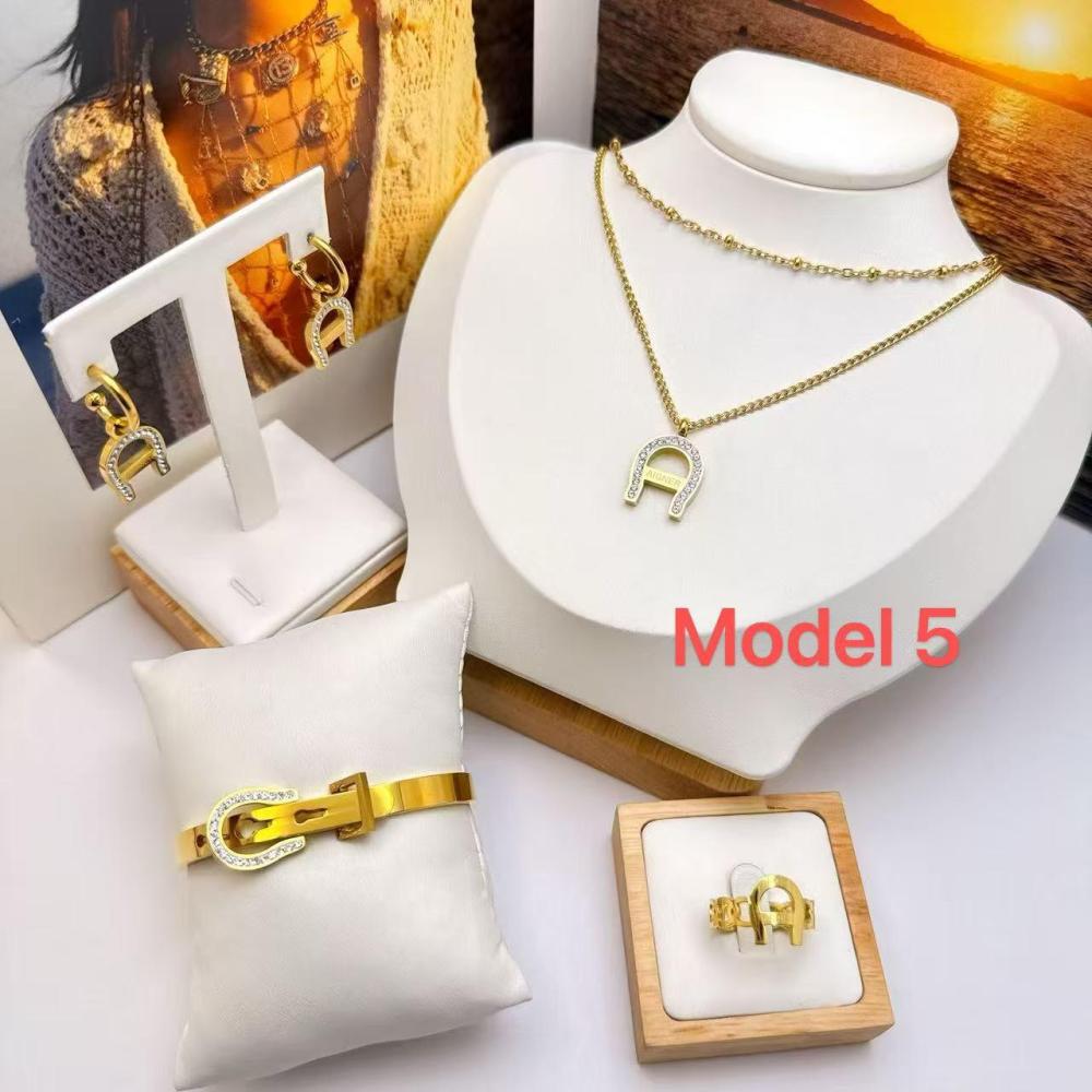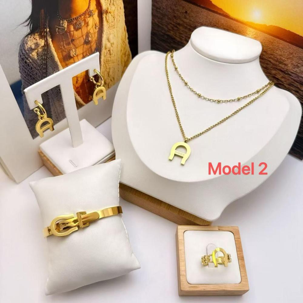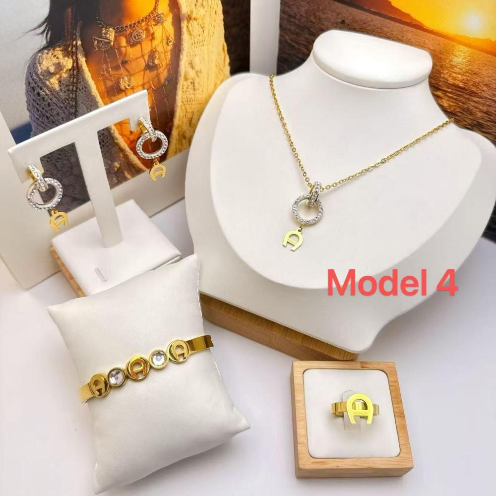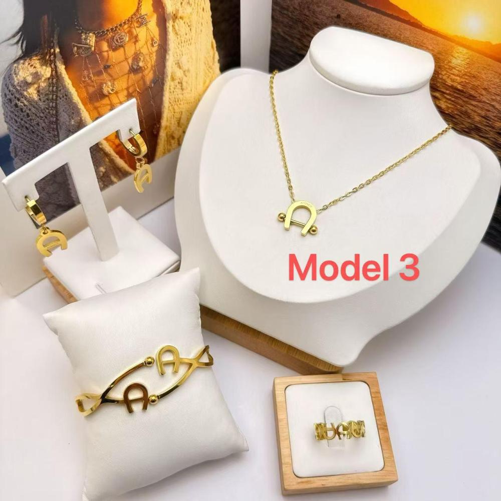 طقم ماركة اقنريتألف من : طوق وحلق وسوار وخاتمالملحقات : كيس وبوكس الماركة متوفر بعدة تصاميماختر التصميم من خيار رقم الموديل